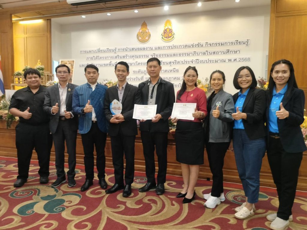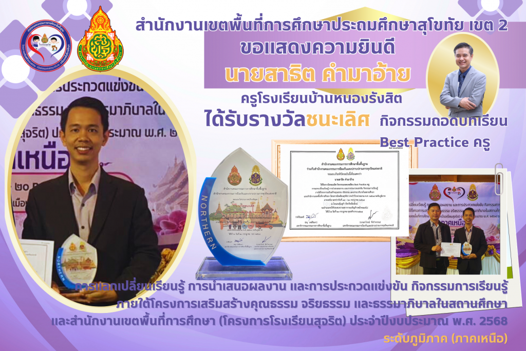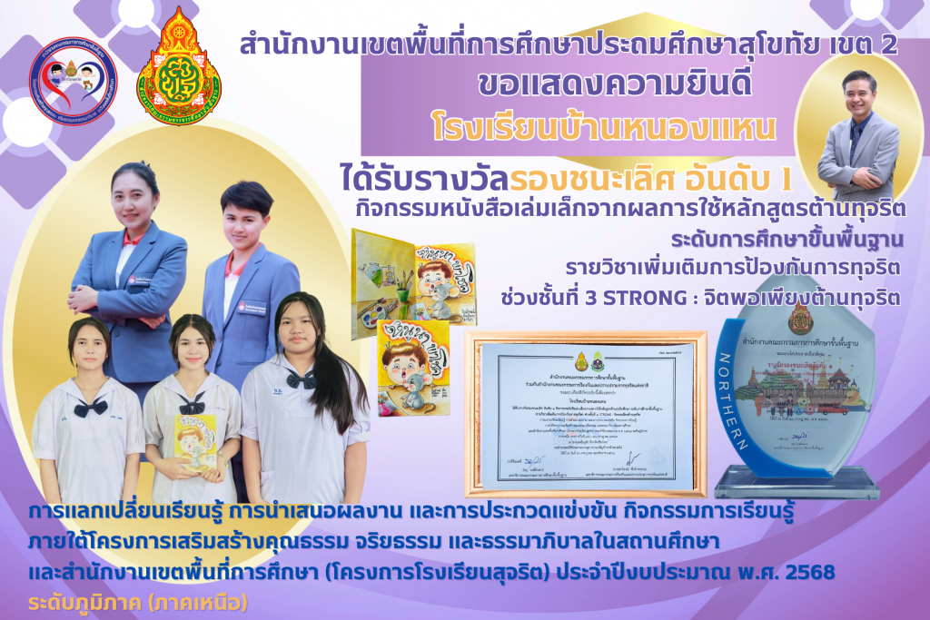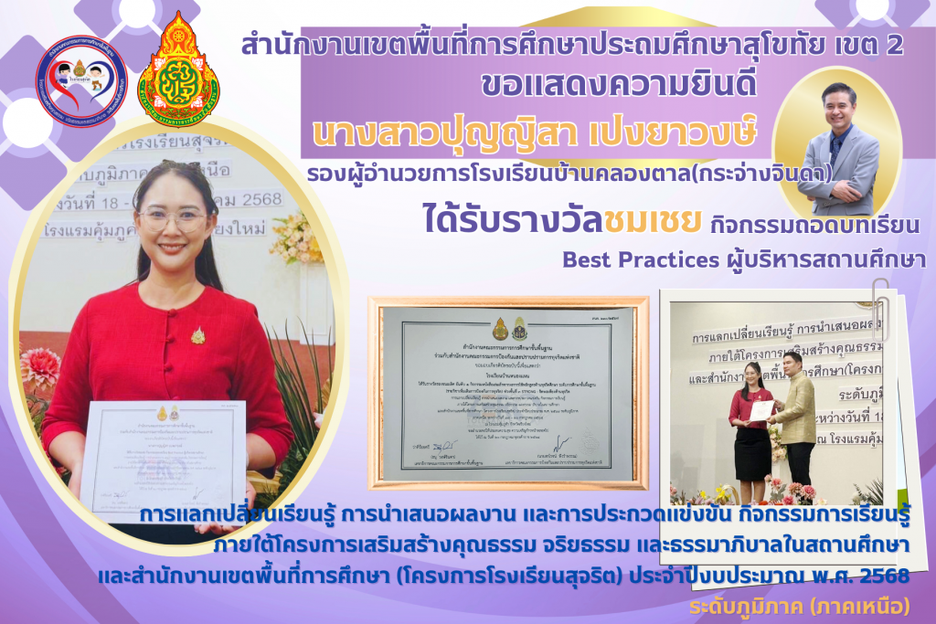 ข้าราชการครูและสถานศึกษาในสังกัด สพป.สุโขทัย เขต 2 เข้าร่วมการนำเสนอผลงานและการประกวดแข่งขันกิจกรรมแลกเปลี่ยนเรียนรู้ การนำเสนอผลงาน และการประกวดแข่งขันกิจกรรมการเรียนรู้ภายใต้โครงการเสริมสร้างคุณธรรม จริยธรรมและธรรมาภิบาลในสถานศึกษา (โครงการโรงเรียนสุจริต) ประจำปีงบประมาณ พ.ศ.2568 ระดับภูมิภาค (ภาคเหนือ) และได้รับรางวัลดังนี้