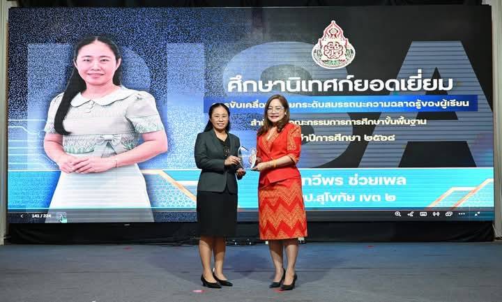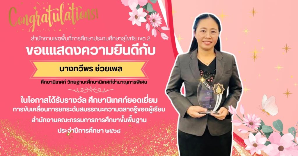 นางทวีพร ช่วยเพล ศึกษานิเทศก์ชำนาญการพิเศษ สังกัด สพป.สุโขทัย เขต 2 ได้รับรางวัลศึกษานิเทศก์ยอดเยี่ยมที่มีบทบาทสำคัญในการขับเคลื่อนการยกระดับสมรรถนะความฉลาดรู้ของผู้เรียน สำนักงานคณะกรรมการการศึกษาขั้นพื้นฐาน ประจำปีการศึกษา 2568 จาก ดร.เกศทิพย์ ศุภวานิช รอง เลขาธิการ กพฐ. ซึ่งเป็นรางวัลที่สำนักงานคณะกรรมการการศึกษาขั้นพื้นฐาน(สพฐ.) ให้กับศึกษานิเทศก์ที่ประสบความสำเร็จในการส่งเสริมและพัฒนาความฉลาดรู้ให้กับนักเรียน เป็นการยกย่องและเชิดชูเกียรติศึกษานิเทศก์ที่มีผลงานดีเด่นในการขับเคลื่อนการยกระดับสมรรถนะด้านความฉลาดรู้ของผู้เรียน ซึ่งเป็นสมรรถนะที่สำคัญของนักเรียน ซึ่ง สพฐ. มุ่งเน้นการพัฒนาและส่งเสริมให้ผู้เรียนมีศักยภาพด้านนี้อย่างเต็มที่….