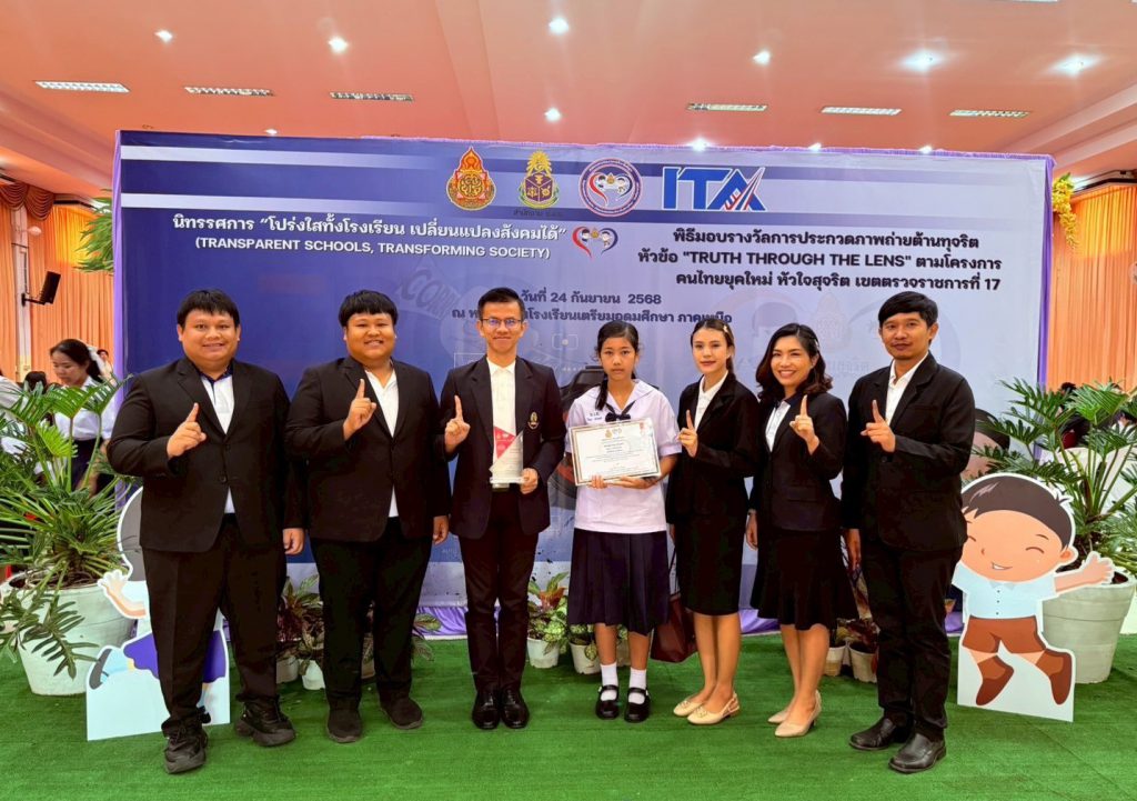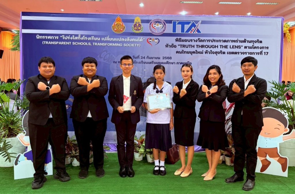 วันที่ 24 กันยายน พ.ศ.2568 ดร.เดชา ลุนาวงค์ ผอ.สพป.สุโขทัย เขต 2 มอบหมายให้ นางสาวปฏิญญา อิ่มเทศ ศึกษานิเทศก์ชำนาญการพิเศษ และ นายสุนทร ชมชิด ศึกษานิเทศก์ชำนาญการ ผู้รับผิดชอบงานหลักสูตรต้านทุจริตศึกษา และโครงการโรงเรียนสุจริต สพป. สุโขทัย เขต 2 เข้าร่วมพิธีการมอบรางวัลการประกวดภาพถ่ายต้านทุจริต หัวข้อ “Truth Through The Lens” ตามโครงการคนไทยยุคใหม่ หัวใจสุจริต เขตตรวจราชการที่ 17 จัดโดย สพม.พิษณุโลก-อุตรดิตถ์