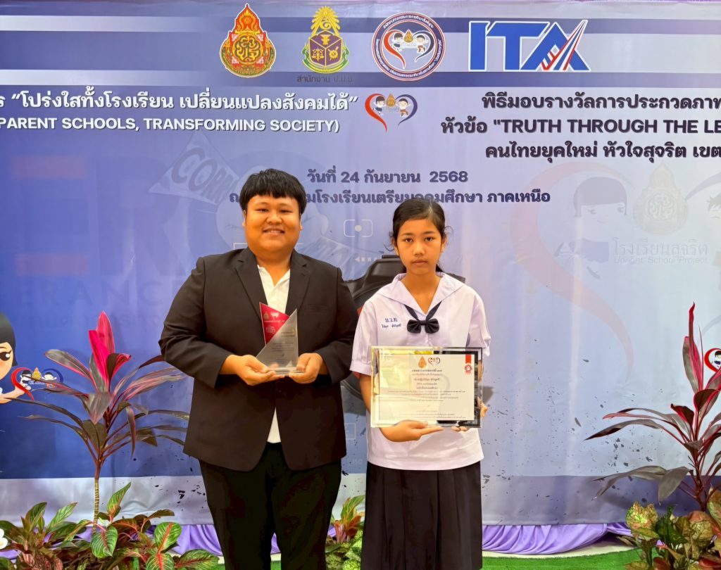 นายปฐพี วรรณชัย และ เด็กหญิงไข่มุก หิรัญศรี นักเรียนชั้น ป.6 โรงเรียนบ้านวังทอง อำเภอศรีสำโรง สพป.สุโขทัย เขต 2 รับรางวัลชนะเลิศการประกวดภาพถ่ายต้านทุจริต หัวข้อ “Truth Through The Lens” ตามโครงการคนไทยยุคใหม่ หัวใจสุจริต เขตตรวจราชการที่ 17 จัดโดย สพม.พิษณุโลก-อุตรดิตถ์ ณ โรงเรียนเตรียมอุดมศึกษาภาคเหนือ จ.พิษณุโลก…(ศน.ปฏิญญา…ภาพ/มฯวรรณ…ข่าว)